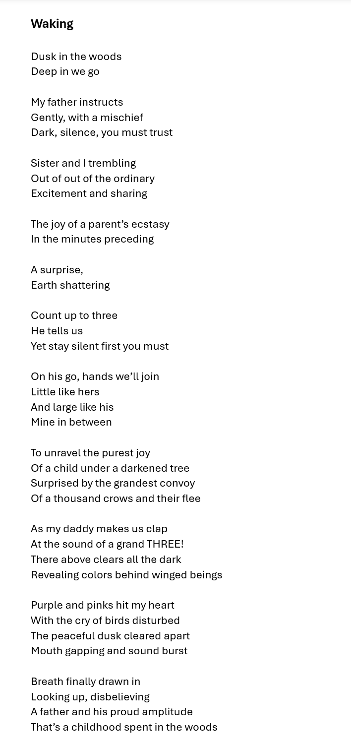 Today, and as we approach the end of my shares for the time being, I ve shared two more poems above, “Waking” and “More Than Rigid” and also wanted to send a small home recording session where I sing along with some of my favorite artists. It’s still very undaring singing but it is fun after all.